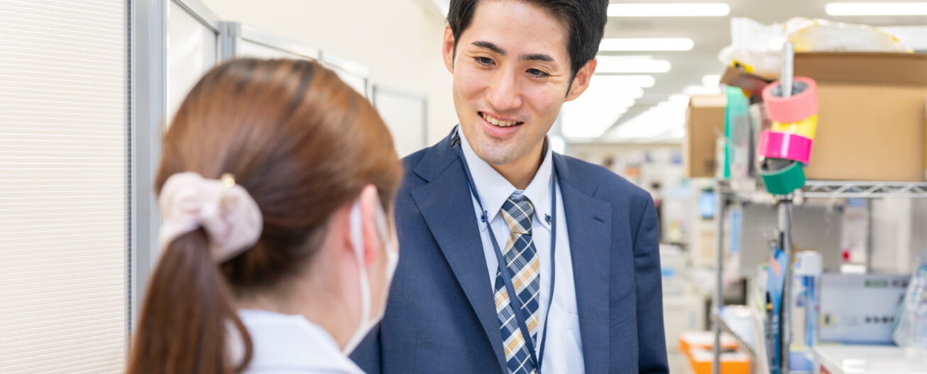 私は資材課で、資材の調達を主に行っています。資材と一口に言っても、ペンなどの事務用品からメスや内視鏡などの医療器具まで様々です。各部署から要望が来るので、納期を確認したり、メーカーさんとやりとりしたりして調達します。